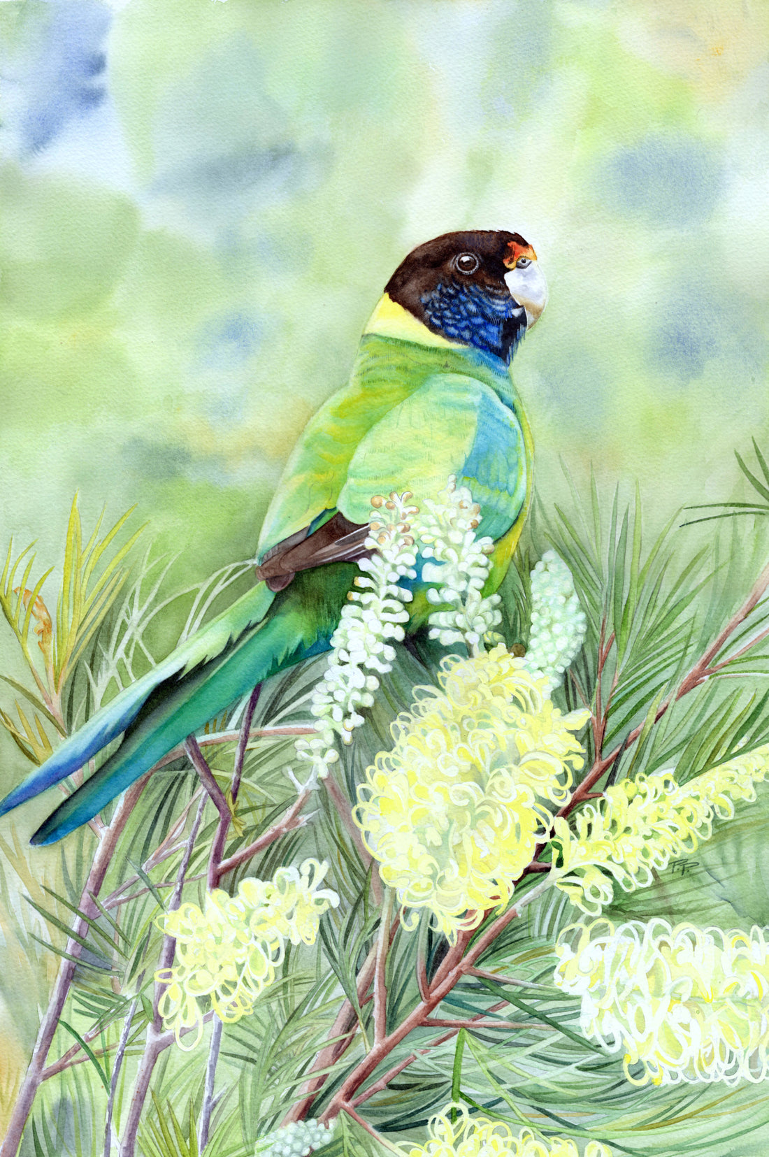 This painting depicts a Brown Honeyeater in a Grevillea bush. The unique and flowers of...
