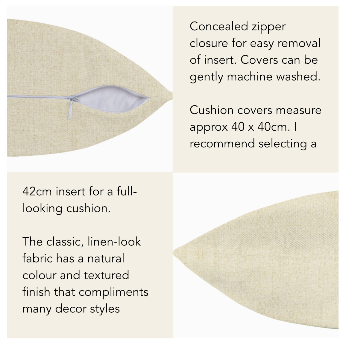 These cushion covers have a classic, natural linen-look texture. The unprinted areas have a natural, creamy tones. They measure approximately 40cm x 40cm but may vary slightly. The cushion covers are sent with no insert. We recommend using a 42cm insert to give the cushion a nice, full body.
