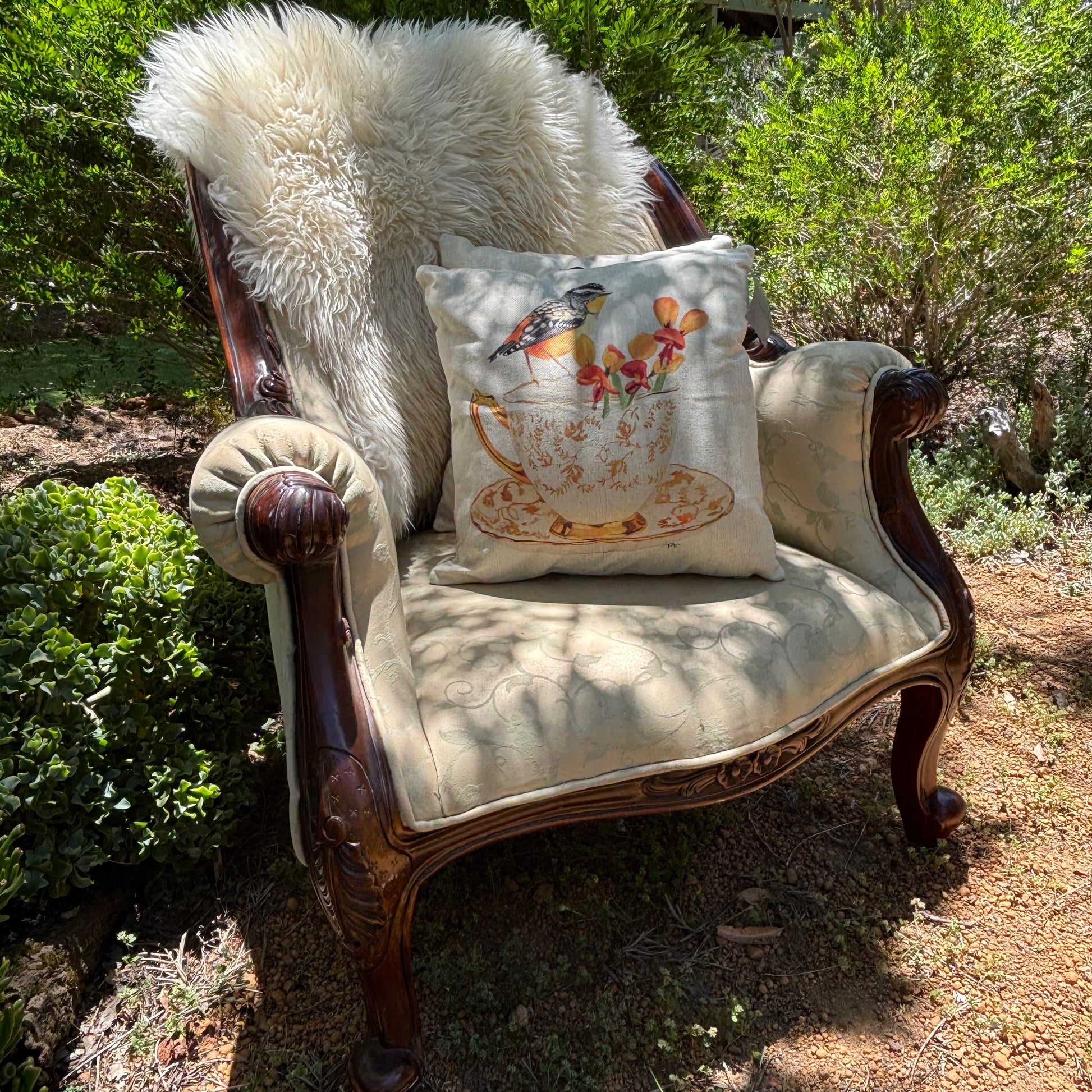 This cushion will bring some Aussie nature and whimsy to your interior. This cushion features a print from my original watercolour painting featuring a Spotted Pardalote, Donkey orchid flowers and a china teacup.