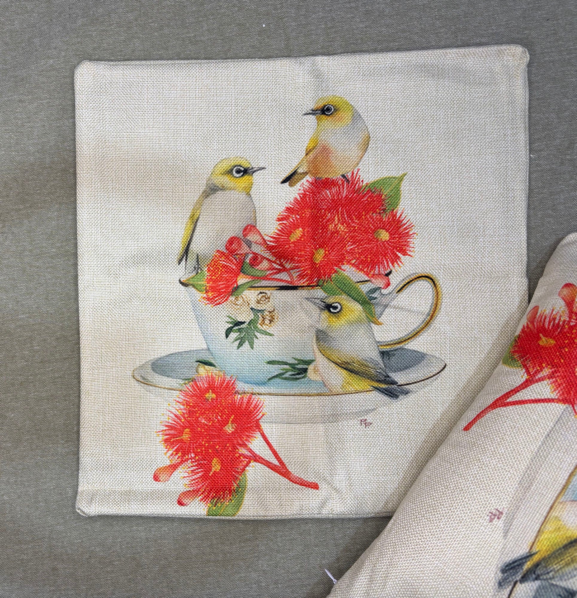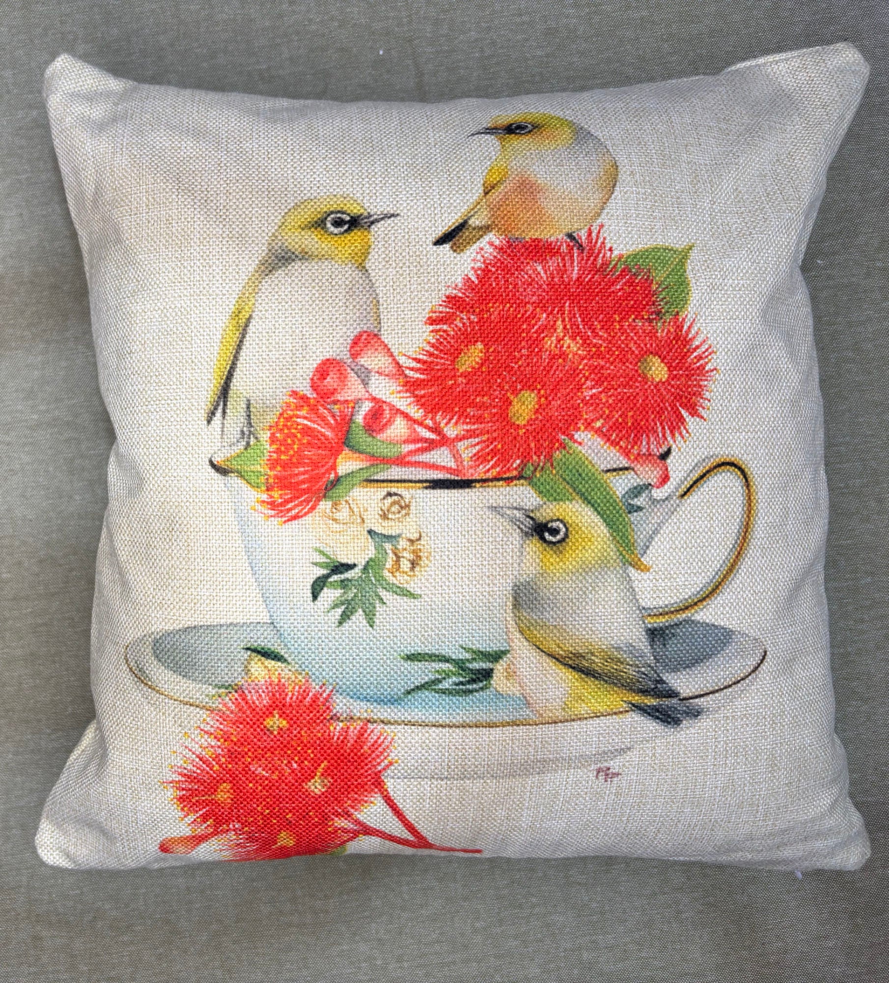 This cushion will bring some Aussie nature and whimsy to your interior. This cushion features a print from my original watercolour painting featuring a collection of Silvereyes with Red-Flowering gum and a china teacup.