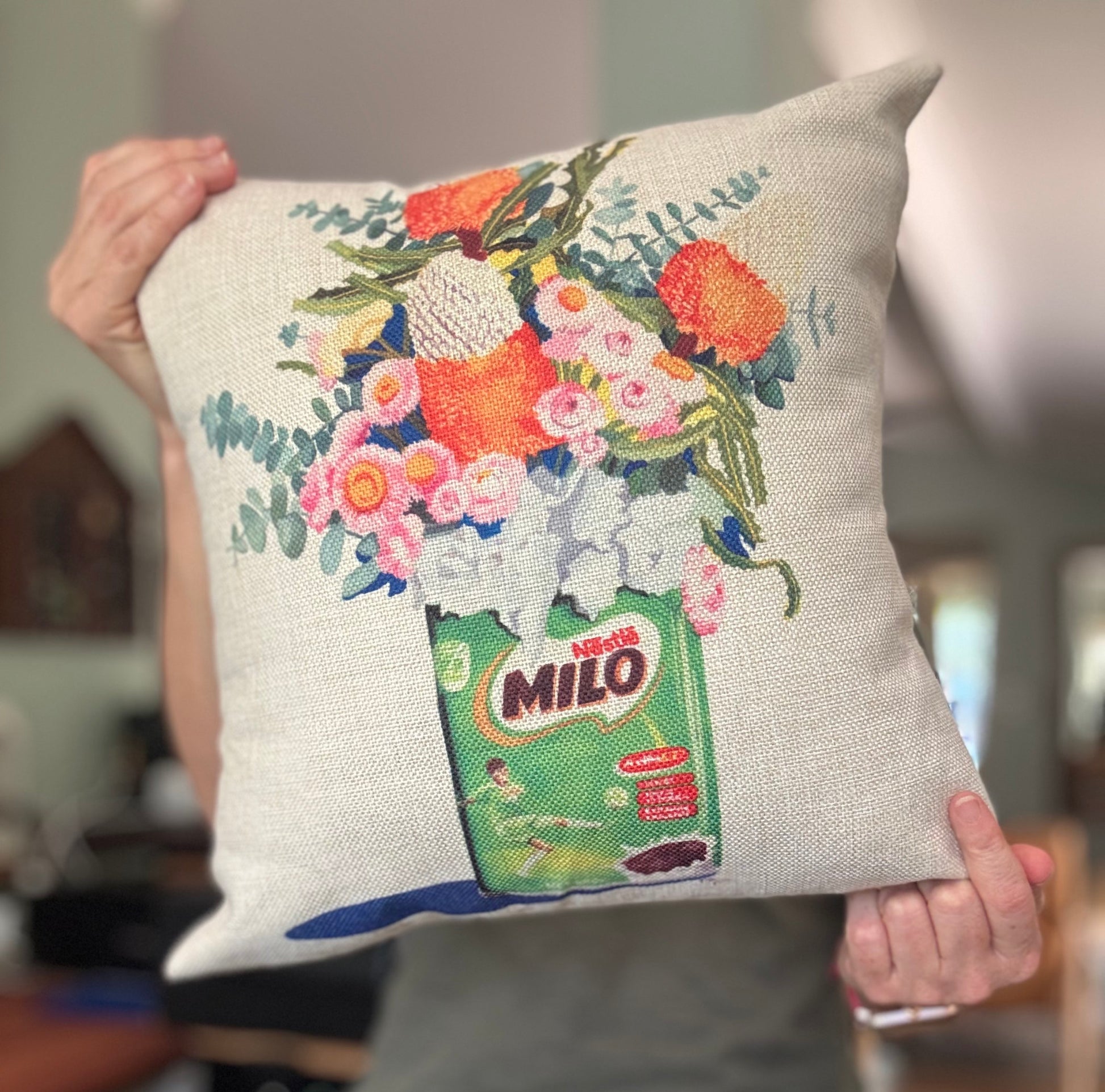 This cushion will bring some Aussie nostalgia to your home. This cushion features a print from my original watercolour painting featuring Australian flowers in a Milo tin vase.