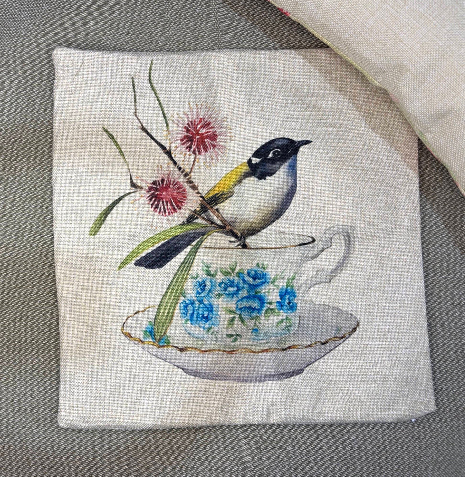 This cushion will bring some Aussie nature and whimsy to your interior. This cushion features a print from my original watercolour painting featuring a Gilbert's Honeyeater (also known as a Swan River or White-naped honeyeater) with a stem of Pincushion Hakea flowers and a china teacup.