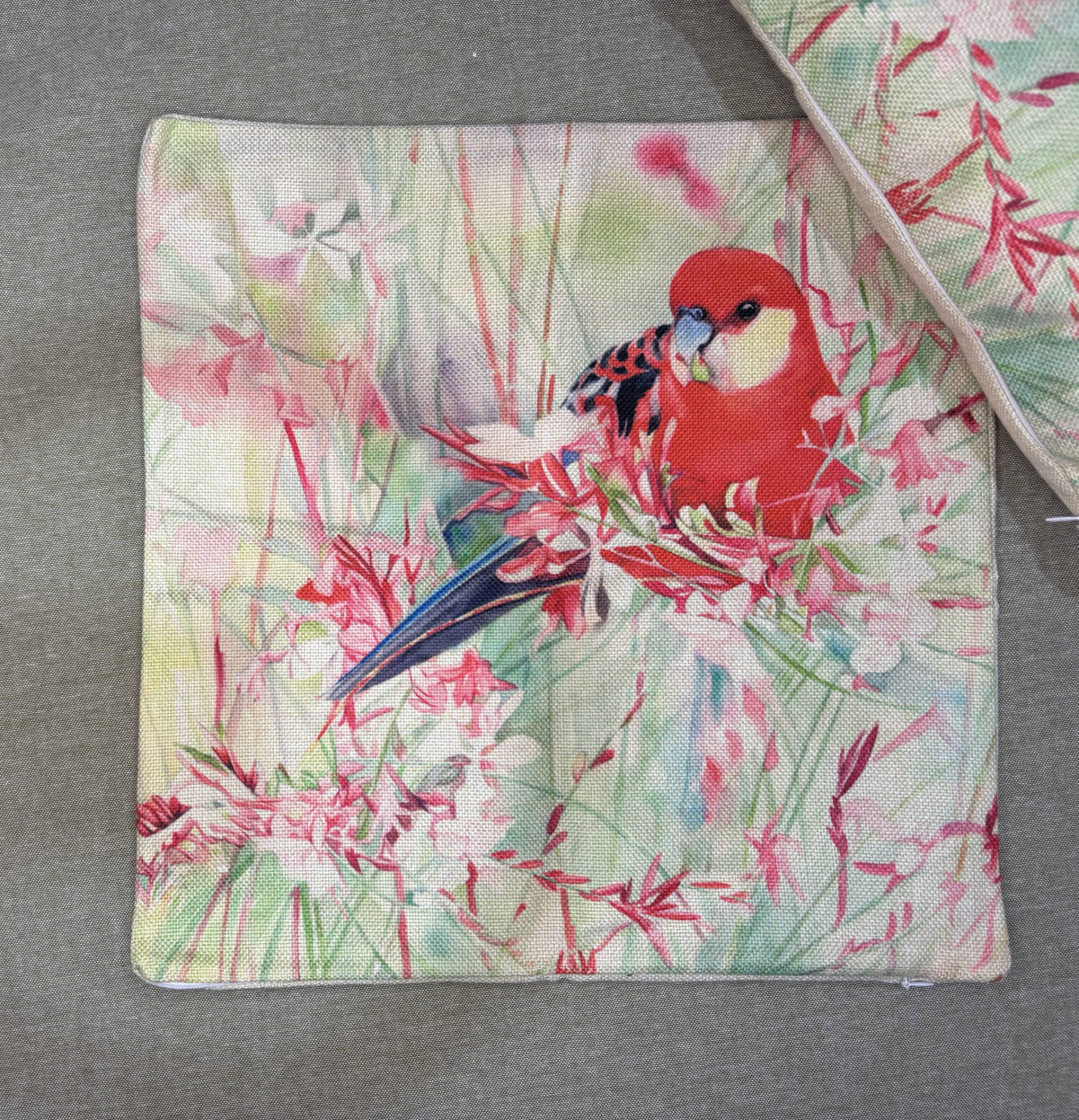 This cushion will bring bit of spring all year round to your interior. This cushion features a print from my original watercolour painting featuring a Western Rosella and Gaura flowers. Pairs well with the Western Rosella (Bottom) cushion cover.